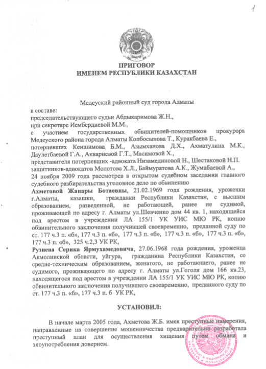 Отбыв за решёткой чуть больше года, она вышла на свободу – суд предоставил Ахметовой отсрочку исполнения наказания до тех пор, пока её сыну исполнится 14 лет (т.е. до 2021 года). И что же – она одумалась? Снова обратимся к казахстанской прессе: «В 2009 году ДБЭКП Алматы возбудил уголовное дело в отношении Жанары Ботаевны Ахметовой по пункту «б» части 3 статьи 177 УК. В деле фигурирует целый отряд заявителей: Б. Кеншимов, Д. Азымханов, М. Ахматулин, Г. Даулентбаев, Х. Масимова, Г. Авакариева. В этом же году Медеуским районным судом в отношении Ахметовой вынесен приговор о лишении свободы сроком на 7 лет с отбыванием наказания в исправительной колонии общего режима и конфискацией имущества. Но поток заявлений не прекращался, и в 2013 году по заявлению С. Пашева Медеуским РОП в отношении Жанары Ботаевны было возбуждено дело по статье 177 УК РК «Мошенничество». В сентябре прошлого года Медеуский районный суд осудил Ахметову по части 3 статьи 177 УК РУ по заявлению Г. Сейдалинова».