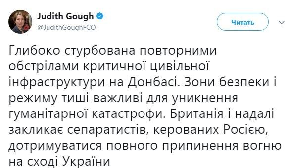 "Глубоко обеспокоена повторными обстрелами критической гражданской инфраструктуры на Донбассе. Зоны безопасности и режима тишины важные для избежания гуманитарной катастрофы", – написал Гоф.