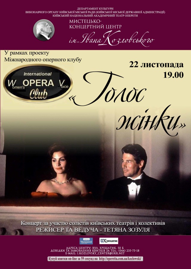 22 ноября в Центре им. Ивана Козловского Национальной оперетты Украины (по адресу: г. Киев, ул. Крещатик, 50-б) - в рамках проекта «Международный оперный клуб «Голос Женщины» - состоится очередное мероприятие.