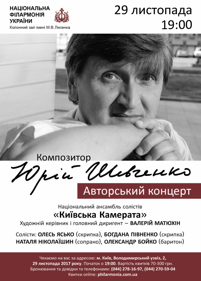 29 ноября, в 19:00, в Колонном зале им.Н.Лысенко Национальной филармонии Украины состоится авторский концерт композитора Юрия Шевченко. В программе будут исполнены произведения, написанные автором за последние пять лет: инструментальные композиции, романсы, номера из театральных постановок, батярские песни, и, конечно, музыка к новому балету «За двумя зайцами», премьера которого с аншлагом состоялась в этом году в Национальной опере Украины.