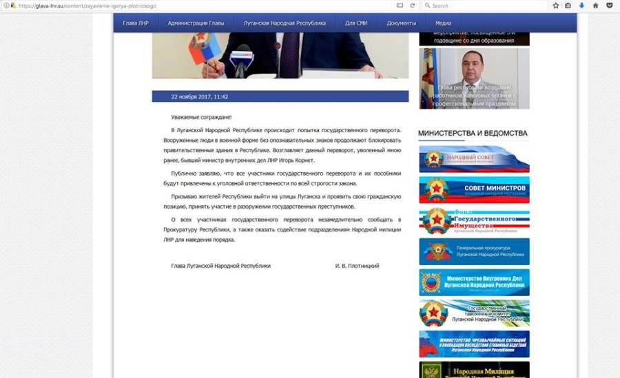 Ниже одно из его последних обращений к местному народонаселению. Фактически это крик о помощи, призыв выйти на улицы и не остановить боевиков Корнета. Провисело это сообщение на так называемом официальном сайте "ЛНР" совсем недолго, его зачистили так же, как и другие упоминания о Плотницком.