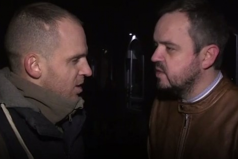 Ведущий телеканала NewsOne Василий Голованов жестко поспорил с активистами, которые заблокировали вход на канал. Активисты продолжали называть свою акцию символической и отрицали, что это давление на деятельность журналистов.