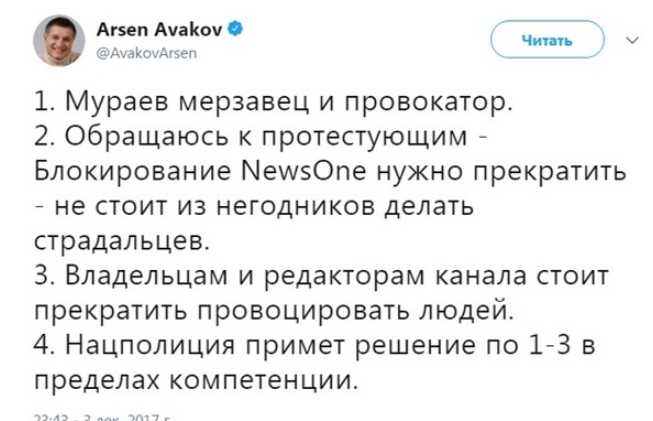 "Обращаюсь к протестующим: блокирование NewsOne нужно прекратить – не стоит из негодников делать страдальцев", – написал Аваков.