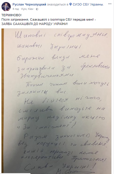По словам адвоката Саакашвили Павла Богомазова, суд, вероятно, только в понедельник, 11 декабря, изберет меру пресечения его подзащитному. В прокуратуре заявили, что будут ходатайствовать о домашнем аресте для Саакашвили. Еще один адвокат опального политика Руслан Чорнолуцкий сообщил, что Саакашвили объявил в СИЗО голодовку и написал обращение к украинскому народу. "Власть барыг задержала меня по ложным обвинениям. Таким образом, они хотят вас запугать. Не бойтесь ничего, смело выходите на мирную воскресную акцию "За импичмент". Вместе защитим Украину от коррупции и произвола", - отмечается в обращении Саакашвили.