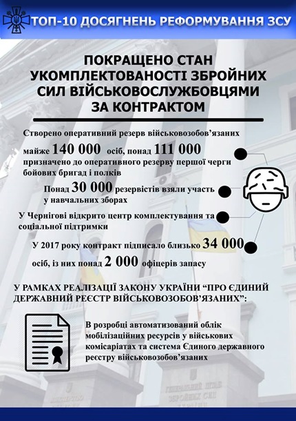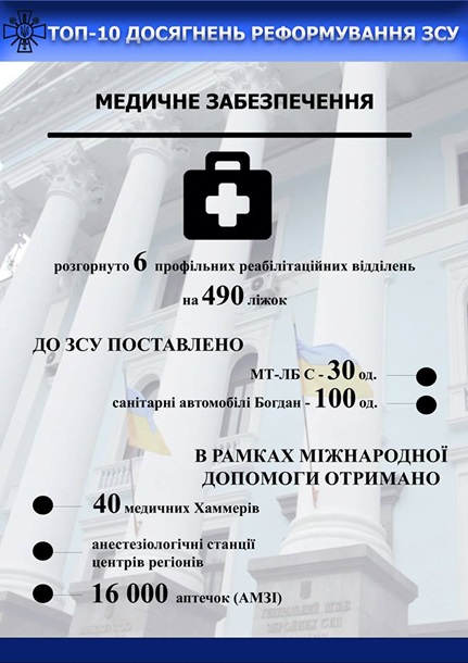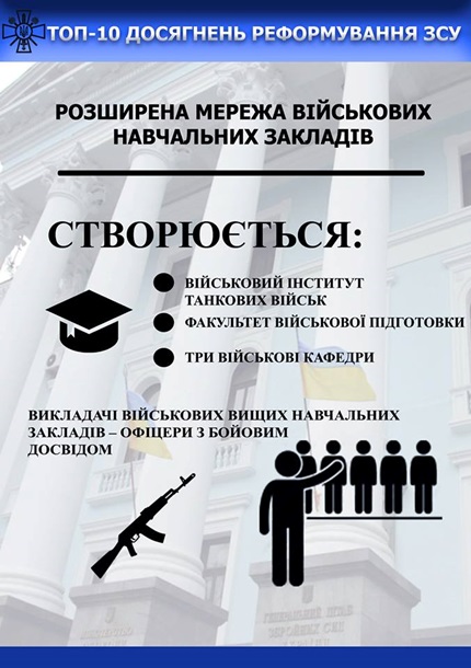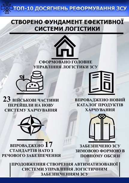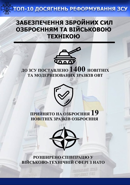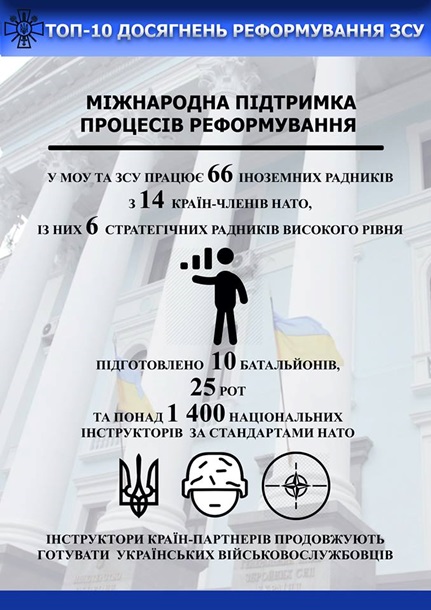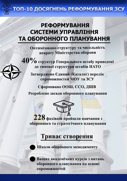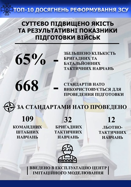 Так, среди достижений реформы в оборонной сфере генерал указал усовершенствование системы управления и оборонного планирования, увеличение количества тактических учений на бригадном и батальонном уровнях с использованием более 650 стандартов НАТО в процессе подготовки военных.