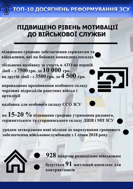 Также Полторак напомнил об увеличении денежного обеспечения военнослужащих, переходе более 20 в/ч на новую систему питания, создании оперативного резерва в составе почти 140 тысяч штыков, формировании учебных центров и институтов.