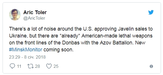 "Немало шума вокруг официального согласия правительства США на продажу противотанковых ракетных комплексов Javelin Украине, но на линии фронта на Донбассе батальон Азов уже имеет изготовленное в США летальное вооружение", – говорится в сообщении.