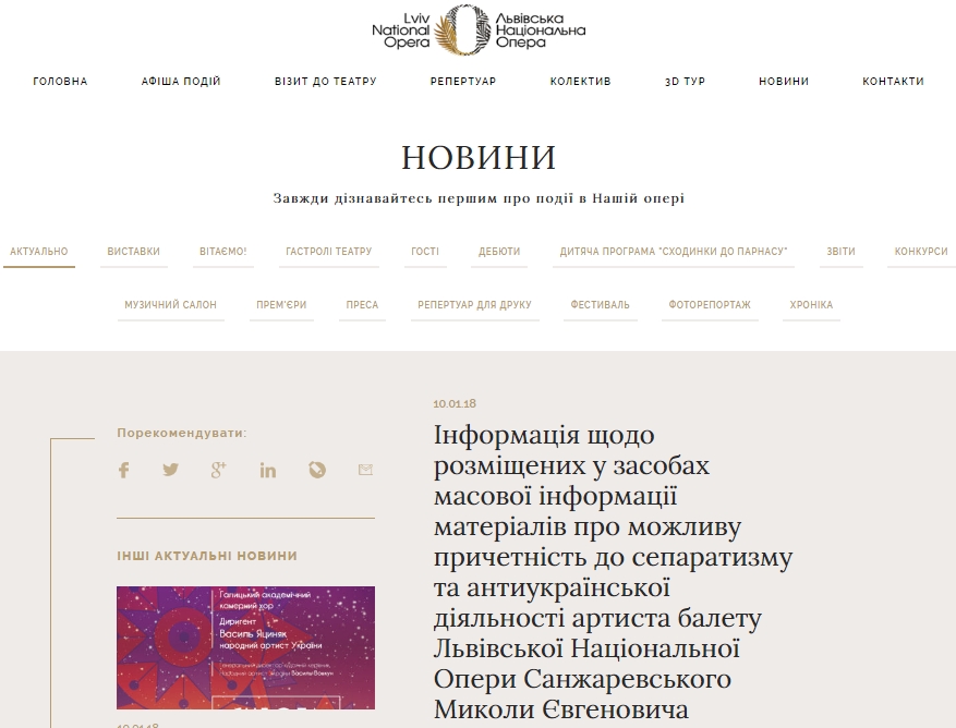 Львовская Национальная опера обратилась с официальным запросом в управление Службы безопасности Украины во Львовской области из сообщений в СМИ о возможной причастности к сепаратизму и антиукраинской деятельности артиста Николая Санжаревского.