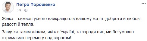Президент Украины Петр Порошенко поздравил украинок с праздником и отметил, что они "символ всего лучшего, что есть в жизни". Об этом он написал на своей странице в Facebook по случаю Международного женского дня.