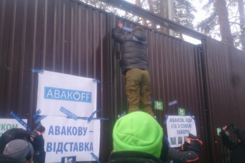 Несколько десятков человек под домом министра развернули плакаты, подняли флаги Украины и скандировали "Аваков, выходи!".