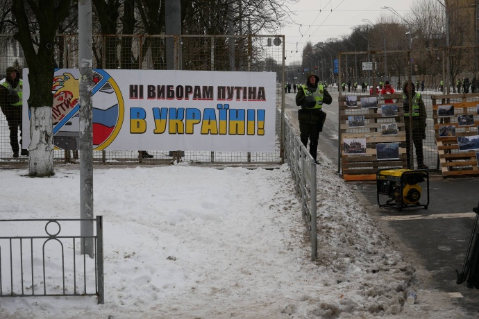 На металлических решетках Нацгвардии висят плакаты "Долой московских оккупантов холуев", "Нет выборам Путина в Украине".