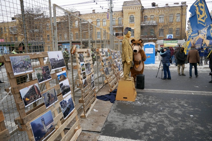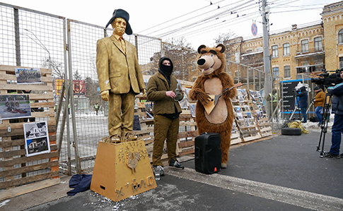 Также националисты поставили у входа фигуру медведя с балалайкой, "ватника" в ватных сапогах и "памятник Путину" в золоте с надписью "х...ло".