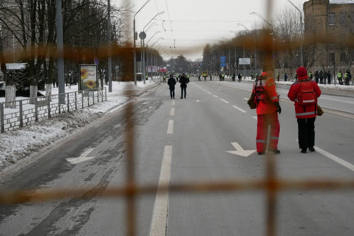С самого утра полиция и Нацгвардия перекрыла металлическим решеткам проезд на участке Воздухофлотского проспекта до посольства.