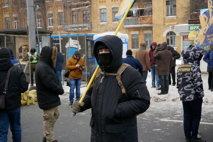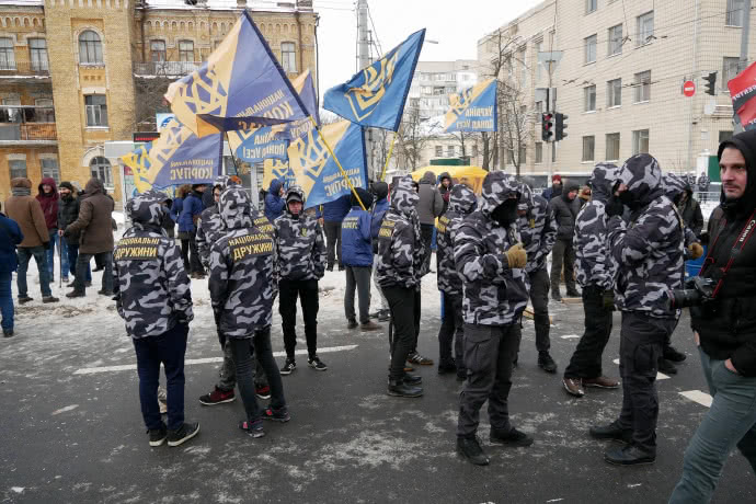 Возле здания также присутствует около 30-40 представителей Нацкорпуса и Нацдружин, 20-25 представителей ВО "Свобода", 10-15 "Правого сектора", также представители ВОО "Сокол".