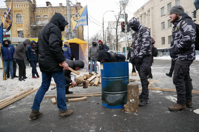 Они поставили у здания бочку, привезли дрова и разложили костер.