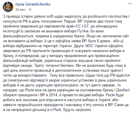 "По поводу истерик некоторых лиц по недопуску в российское посольство и консульства РФ в день голосования. Во-первых, ВР Украины две недели назад приняла обращение к парламентам Стран ЕС и G7, в международные институты с призывом не признавать выборы Путина, потому что они фальсифицируются, в частности в аннексированном Крыму. Если мы призываем мир не признавать эти выборы, и это официальное заявление ВР, было бы странно, если бы эти выборы проходили на территории Украины.