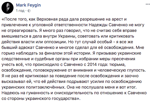 "После того как Верховная Рада дала разрешение на арест и привлечение к уголовной ответственности Надежды Савченко, не могу не отреагировать. Я много раз говорил, что не считаю себя вправе вмешиваться в дела внутри Украины, советовать или критиковать действия власти или оппозиции. Но тут случай особый - я все же бывший адвокат Савченко и многое сделал для ее освобождения. Мне горько наблюдать за финалом этой истории", - написал правозащитник на своей странице в Facebook.