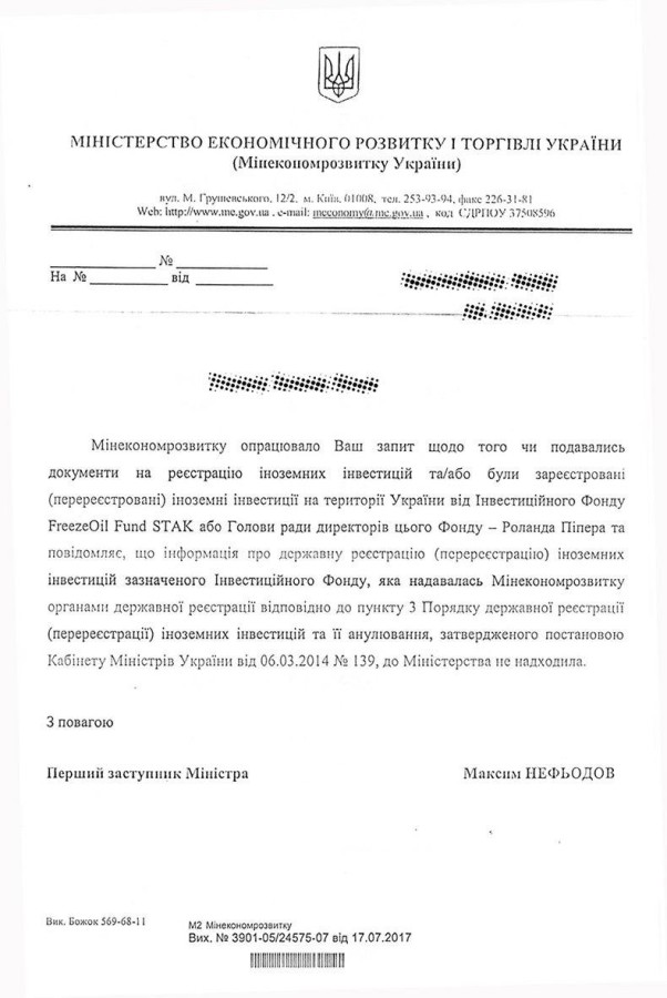 Фонд FreezeOil Fund STAK и Роланд Пипер вообще не совершал в украинскую экономику никаких инвестиций, что подтверждается письмом Министерства экономического развития и торговли Украины в лице Первого заместителя министра М. Нефедова от 17.07.2017 на адвокатский запрос о регистрации иностранных инвестиций на территории Украины от Инвестиционного фонда FreezeOil Fund STAK или Председателя совета этого Фонда Роланда Пипера в период с 2014 года. Минэкономики официально сообщило, что информация о государственной регистрации любых инвестиций от указанного Фонда в Минэкономразвития не поступало.