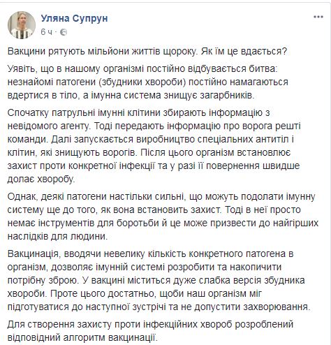 "Вот почему мы все должны быть ответственными не только к собственному здоровью, а и к здоровью других. Делайте прививки и получите свою защиту!", - отметила Супрун.