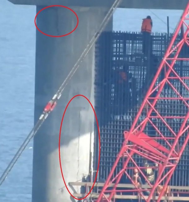 Как пишет издание Кuresh.info, из 595 опор моста, 256-я опора находящаяся практически по средине Керченского пролива, треснула в двух местах.