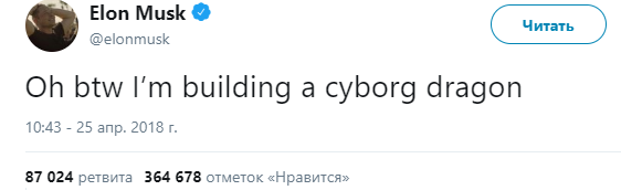 Американский миллиардер Илон Маск заявил, что занят в новом проекте по строительству дракона-киборга. Об этом он написал в своем микроблоге в Twitter.