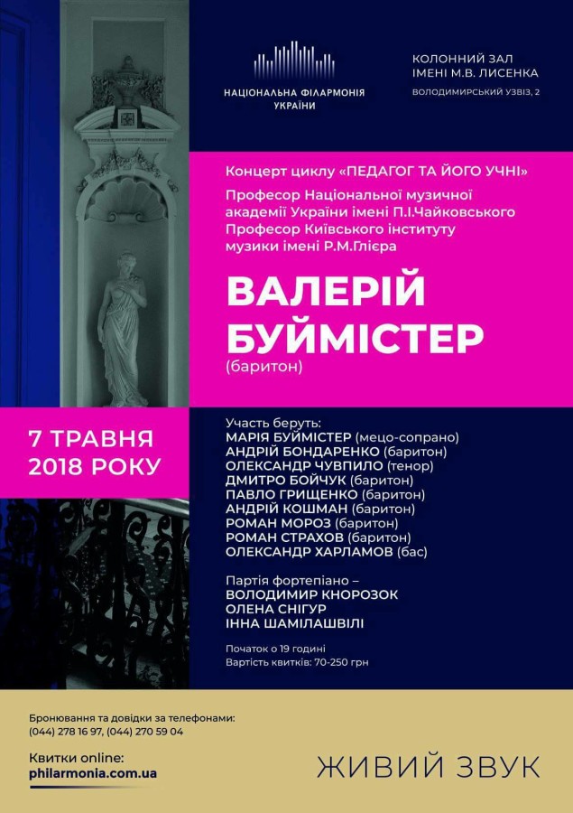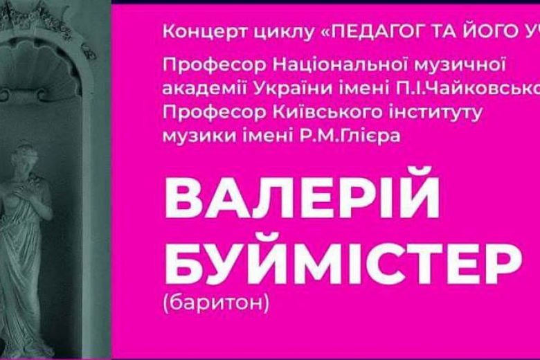 Напомним, что Валерий Буймистер - легенда украинской камерной сцены. Непревзойденный певец, тонкий музыкант и искусный интерпретатор мировых шедевров. Уже более 20 лет он преподает в лучших музыкальных заведениях Киева. Киевский зритель получит редкую возможность насладиться мастерством его талантливых учеников - солистов столичных театров, лауреатов международных конкурсов и певцов, которые только начинают свой творческий путь.