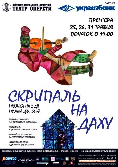В традиционной культуре музыкант-скрипач сопровождает все этапы жизни еврейской семьи. Он стал символом жизненного уклада, знаковым образом сочетания устойчивости и свободы. Мюзикл «Скрипач на крыше» Национальной оперетты Украины - попытка современного отображения сложного сочетания разногласий жизни. Философская и лирическая постановка, где в сценической реальности актерского бытия играют музыка, цвет и безграничные чувства.