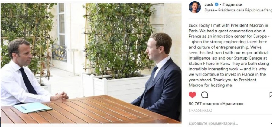"У нас был отличный разговор о Франции как инновационном центре Европы, учитывая сильные инженерные таланты здесь и культуру предпринимательства", - написал Цукерберг.