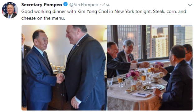 "Хороший рабочий обед прошел сегодня вечером с Ким Ен Чхолем в Нью-Йорке. В меню были стейк, кукуруза и сыр", - написал Помпео в Twitter.