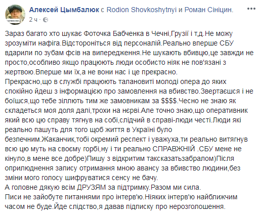 "Прекрасно, что в службе работают талантливые молодые опера, к которым спокойно идешь с информацией о заказе на убийство. Обращаешься и не боишься, что тебя сольют тем же заказчикам за $$$$. Честно, не знаю, как сложится моя судьба дальше, немного на нервах. Но точно знаю, что оперативник, который все это дело тащил на себе, следователь в деле — люди чести", — написал Цымбалюк. Также он гордится тем, что СБУ впервые сыграла на опережение с ФСБ и благодарит всех за помощь и поддержку.