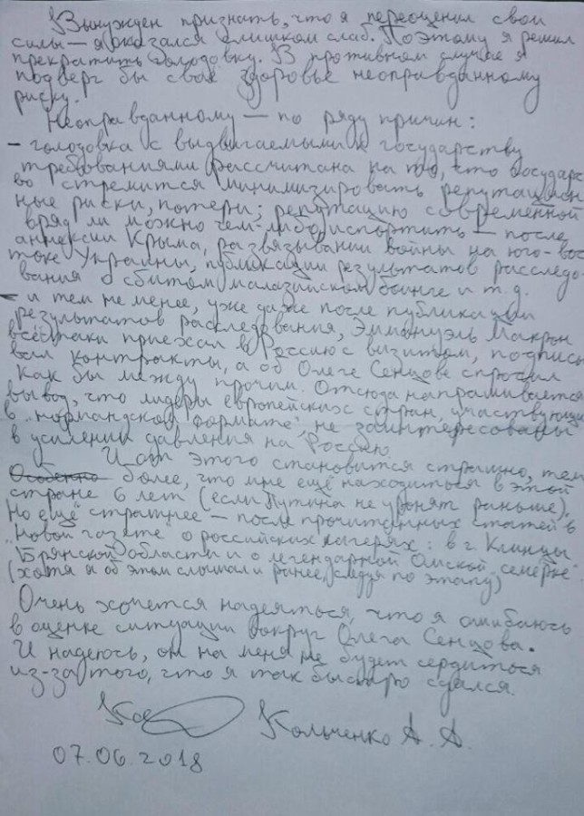 "Очень хочется надеяться, что я ошибаюсь в оценке ситуации вокруг Олега Сенцова. И надеюсь, он на меня не будет сердиться из-за того, что я так быстро сдался", - завершил свое письмо Кольченко.