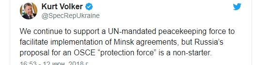 "Мы продолжаем поддерживать идею миротворческих сил с мандатом ООН для облегчения имплементации Минских соглашений, но предложение России о "силах защиты" ОБСЕ не имеет шансов на успех", − отметил Волкер.