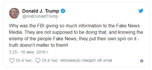 "Почему ФБР передавали так много информации фейковым СМИ? Они не должны были это делать, и зная, что фейковые новости являются врагом народа, они выставляют их в выгодном свете – правда для них не имеет значения!" – написал Трамп в Twitter.