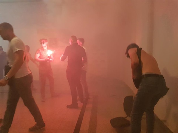По данным местных СМИ, на первом этаже здания молодые люди в футболках "Национального корпуса" бросают дымовые шашки, на втором этаже видны следы массового погрома.