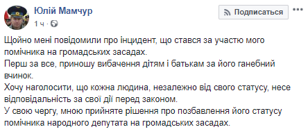 "Только что мне сообщили об инциденте, который произошел с участием моего помощника на общественных началах. Прежде всего, приношу извинение у детей и родителей за его позорный поступок. Хочу подчеркнуть, что каждый человек, независимо от своего статуса, несет ответственность за свои действия перед законом . В свою очередь, мной принято решение о лишении его статуса помощника народного депутата на общественных началах", - отметил Мамчур.