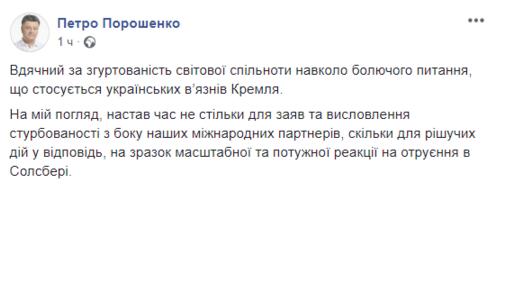 Петр Порошенко призвал мировое сообщество отреагировать на украинских политзаключенных в России, как на отравление в Солсбери бывшего российского шпиона Сергея Скрипаля и его дочери Юлии.