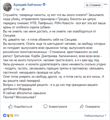 Ну, давайте так - я готов обменять себя на Сенцова", - написал Бабченко в Фейсбуке.