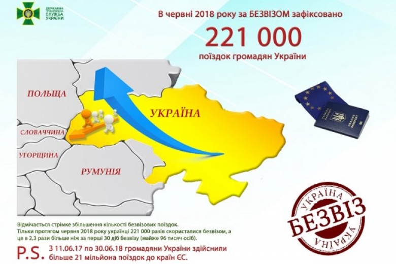 Также в июне этого года зафиксирована 221 тыс. поездок украинцев по безвизу, а это в 2,3 раза больше, чем за первые 30 суток безвизового режима (96 тыс. человек). Сейчас количество "безвизовиков" в среднем составляет от 9 тыс. до 12 тыс. человек в сутки.