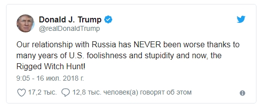 "Наши отношения с Россией еще никогда не были хуже благодаря многолетней глупости и тупости руководства США, а также нынешней охоте на ведьм", – написал Трамп.