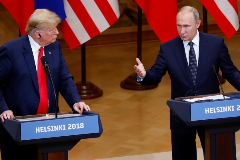 Мужчину, который держал в руках лист с надписью, силой вывели из зала сотрудники служб безопасности за несколько минут перед началом пресс-конференции президента США Дональда Трампа и президента России Владимира Путина в Хельсинки (Финляндия).