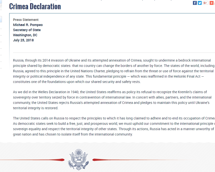 Госдепартамент США опубликовал Крымскую декларацию, согласно которой Соединенные Штаты не признают Крым частью России. Документ, подписанный госсекретарем Майком Помпео, опубликован на официальном сайте ведомства.