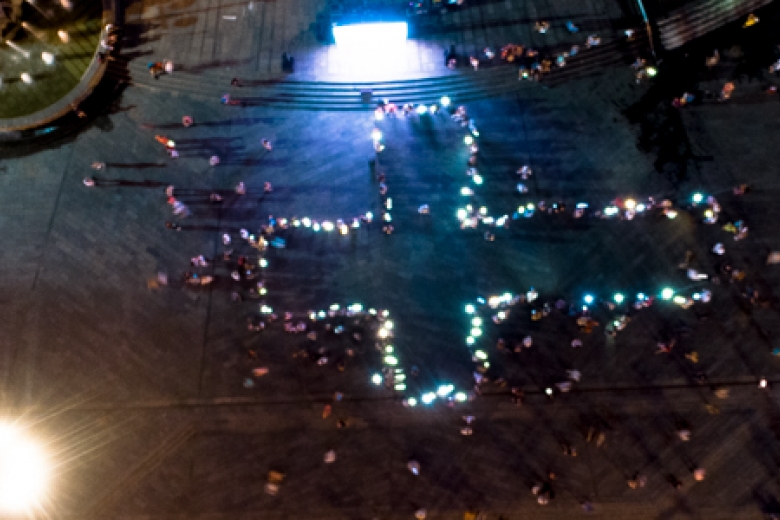 Люди подняли кверху свои смартфоны с зажженными вспышками и экранами. На несколько минут Майдан независимости засиял сотней ярких лампочек.
