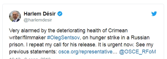 "Очень встревожен ухудшением состояния здоровья крымского писателя и кинорежиссера Олега Сенцова, который голодает в российской тюрьме. Я повторяю свой призыв освободить его. Это очень срочно", - сообщил Дезир в своем Twitter.