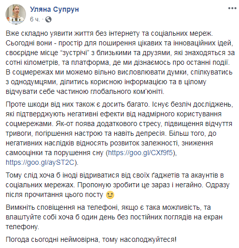 И.о. министра здравоохранения Ульяна Супрун продолжила публиковать здоровые советы у себя на странице в Facebook. В этот раз она написала, чем опасны социальные сети.