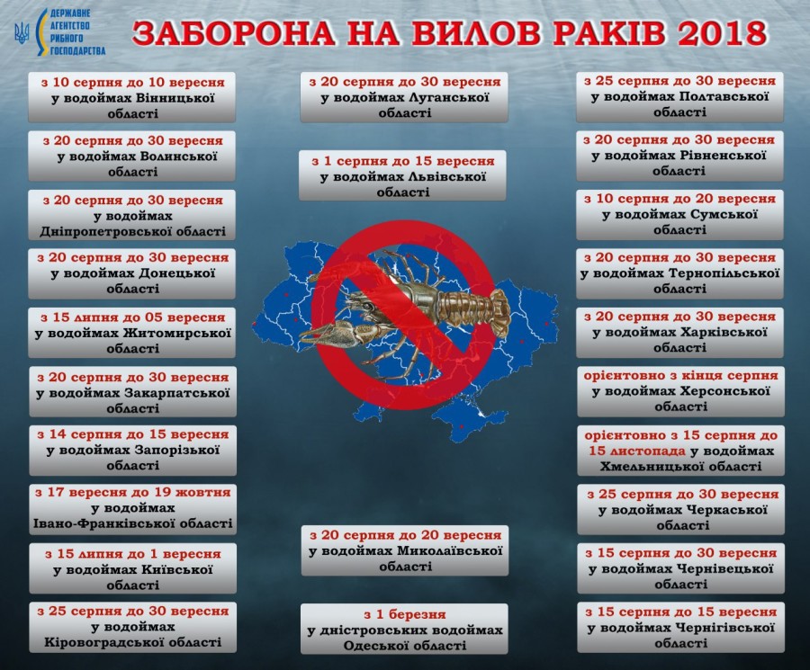 "Это (временный запрет на вылов) связано с тем, что в этот период раки меняют свой хитиновый покров на новый, иными словами линяют. В это время они особенно нуждаются в усиленном питании и поэтому бросаются на любую наживку, что существенно облегчает их вылов. На территории Днепропетровской области во всех водоемах, включая и места их разведения для вылова, ловля этих речных обитателей категорически запрещена с 20 августа по 30 сентября включительно", - рассказал начальник управления Государственного агентства рыбного хозяйства Украины в Днепропетровской области Василий Волков.