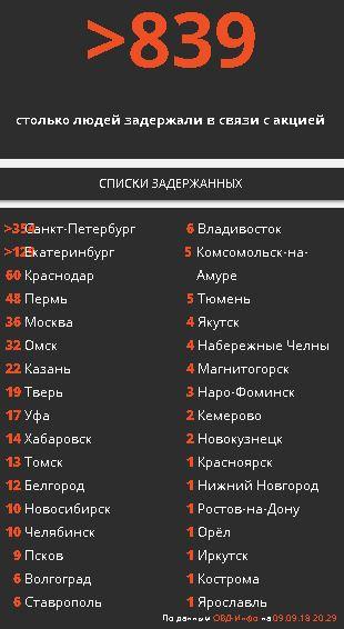 По уточненным данным правозащитной организации «ОВД-Инфо», по всей России из-за участия в митингах против повышения пенсионного возраста задержаны 839 человек.