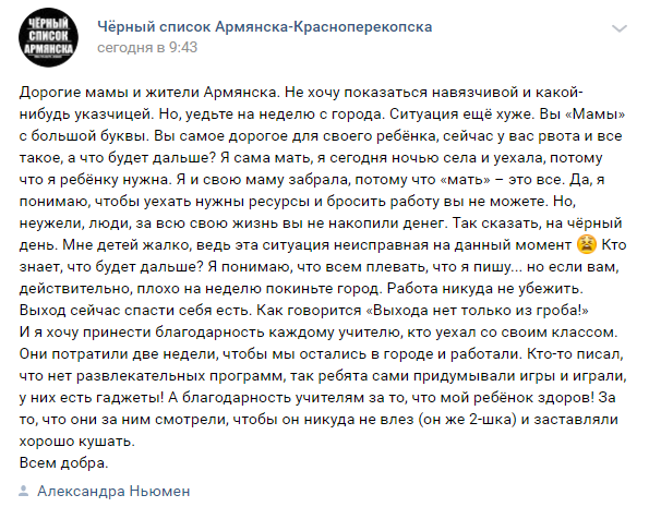 "Мне детей жалко, ведь эта ситуация неисправная на данный момент… Если вам действительно плохо, на неделю покиньте город. Работа никуда не убежит. Выход сейчас спасти себя есть. Как говорится, выхода нет только из гроба", - написала пользователь Александра Ньюмен.