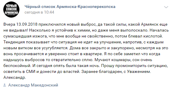 "13 сентября приключился новый выброс, да такой силы, какой Армянск еще не видывал! Насколько я устойчив к химии, но даже меня выполоскало. Началась сумасшедшая изжога, что мне вообще не свойственно, потом блевал кислотой. Тенденция показывает, что ситуация не идет на улучшение, напротив, с каждым новым витком все усугубляется. Дома все закрыто и закупорено, несмотря на это вонь просачивается и уверенно стоит в квартире", - поделился пользователь с ником Александр Македонский в соцсети.
