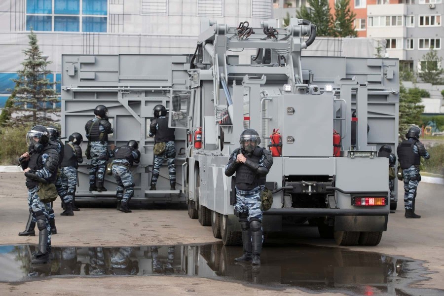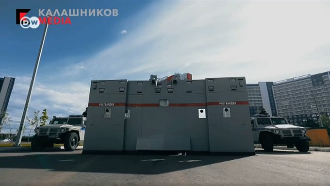 Построен он концерном "Калашников" на базе грузовика "КамАЗ". На стеклах – металлические решетки, кузов обшит толстыми листами металла. При необходимости он за три минуты превращается в заграждение шириной 7,5 метров. Несколько таких машин могут полностью перекрыть любую российскую улицу.