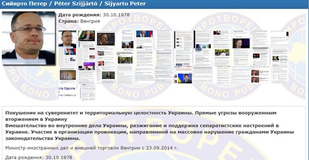 Министр иностранных дел и внешней торговли Венгрии Петер Сийярто попал в базу сайта Миротворец. Причиной называется "покушение на суверенитет и территориальную целостность Украины. Прямые угрозы вооруженным вторжением в Украину".